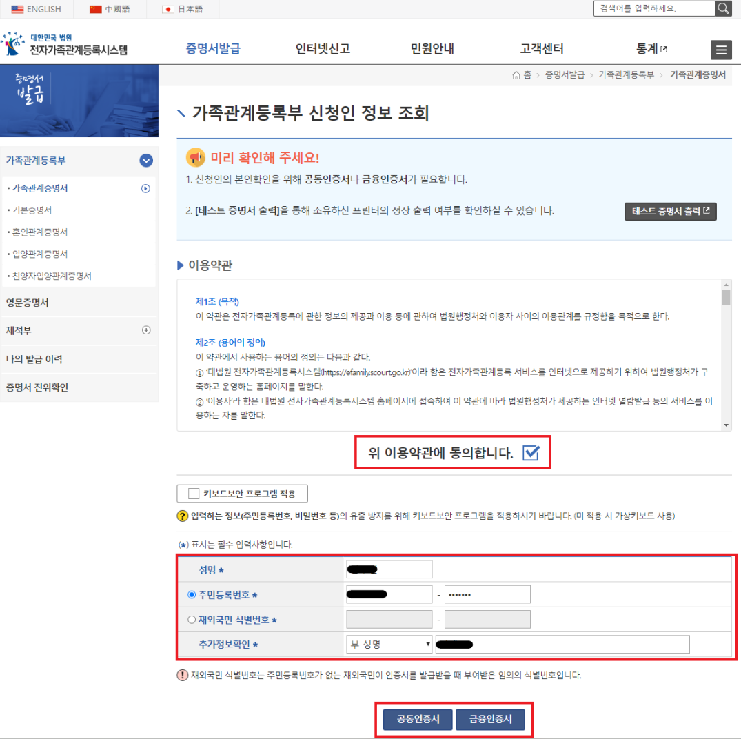 3. 가족관계등록부 신청인 정보 조회에서 약관에 동의하고 정보 입력,