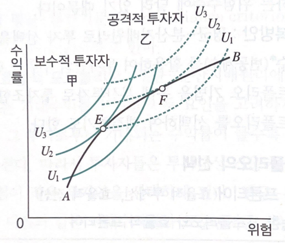 최적 포트폴리오는 효율적 프론티어와 투자자의 무차별 곡선이 접하는 점에서 결정된다. 따라서 투자자 甲과 투자자 乙의 최적 포트폴리오는 각각의 무차별 곡선과 효율적 프론티어가 접하는 E와 F에서 결정된다. 위험회피형 투자자 중 甲은 투자자 乙보다 상대적으로 기대수익률이 낮으나 위험도 작은 E점을, 투자자 乙은 상대적으로 위험이 크지만 기대수익률도 큰 F점을 최적 포트폴리오로 선택한다. 즉, 위험회피형 투자자 중에서 공격적인 투자자(乙)는 보수적인 투자자(甲)에 비해 위험이 높더라도 기대수익률이 높은 투자안을 선호한다고 할 수 있다. 이처럼 한 투자자에게 최적이 투자 대안이 다른 투자자에게는 최적이 아닐 수 있다. 결국 투자자의 효용을 극대화해 주는 최상의 포트폴리오인 최적 포트폴리오의 선택 문제는 위험과 수익의 상쇄 관계에 의한 투자자의 선택 또는 효용에 달려 있다.